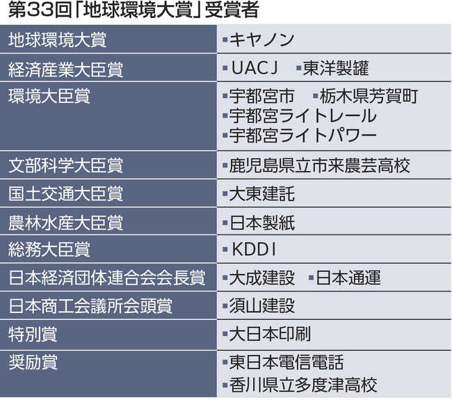 経済産業大臣賞はリサイクル素材の使用量を大幅に引き上げた飲料缶のふたを開発したUACJと東洋製罐、環境大臣賞は地元で発電した再生可能エネルギーで走る次世代型路面電車(LRT)を実現した宇都宮市と栃木県芳賀町、宇都宮ライトレール、宇都宮ライトパワー、文部科学大臣賞はコオロギを養鶏に活用した鹿児島県立市来農芸高校が受賞しました。