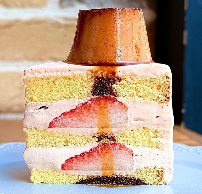 濃厚なバスクチーズケーキでいちごの果実とプリンをサンドしました。
