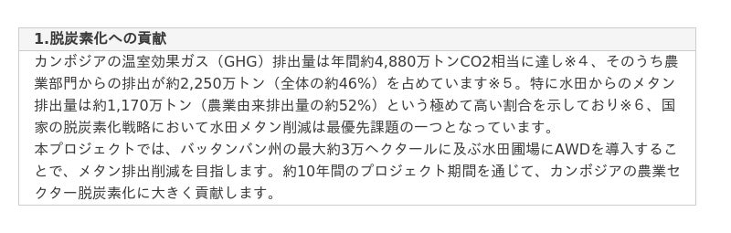 本プロジェクトは、バッタンバン州の対象水田圃場にAWD(間断灌漑※2)を導入し、メタンガス排出量の削減を目指します。2025年4月のプロジェクト開始後、3年以内に同州の水田約3万ヘクタールへと拡大し、10年間で累計約130万トンのカーボンクレジットの創出を見込みます。また、本プロジェクトは、カンボジアにて実用化に向けた展開をする水田メタン排出削減事業としては日本企業初であり、持続可能な農業と気候変動対策を両立する先駆的な取り組みとなります。