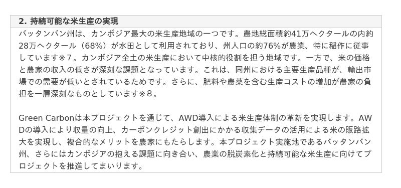 ネイチャーベースのカーボンクレジット創出・販売事業を展開するGreen Carbon株式会社(代表取締役:大北潤、以下Green Carbon(グリーンカーボン))は、カンボジア北西部バッタンバン州における水田由来のカーボンクレジット創出プロジェクト(以下、本プロジェクト)に向けて、バッタンバン州農林水産局(Provincial Department of Agriculture, Forestry, and Fisheries、以下PDAFF※1)とMOUを締結したことをお知らせします。