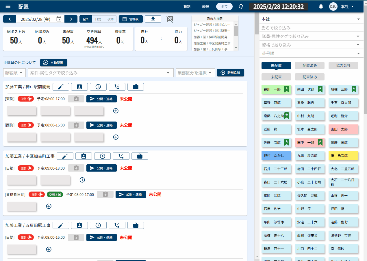 ・自動配置の条件設定:労働時間、不仲関係、出禁リスト、スキル要件、経験値などを事前に設定