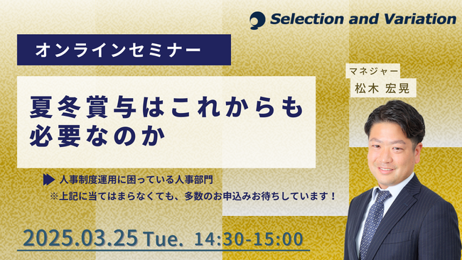 組織・人事コンサルティングファームであるセレクションアンドバリエーション株式会社(以下、当社、東京都千代田区丸の内、大阪市西区、名古屋市西区 / 代表取締役社長:平康慶浩/ URL:https://sele-vari.co.jp/ )は「夏冬賞与はこれからも必要なのか」セミナーを2025年3月25日(火)14:30~15:00に開催することをお知らせいたします。