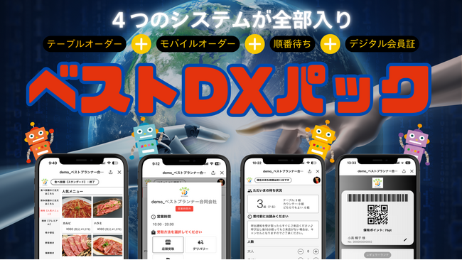 2025年3月1日より、飲食店向けの新パッケージシステム「ベストDXパック」の提供を開始いたします。本サービスでは、ランクアップ機能付き会員証・順番待ちシステム・テーブルオーダーシステム・モバイルオーダーシステムの4つの機能を一つにまとめました。人手不足や夜間対応、注文ミスなど、忙しい飲食店特有の課題を効率的に解消し、売上アップと顧客満足度の向上を同時に実現することを目指しています。