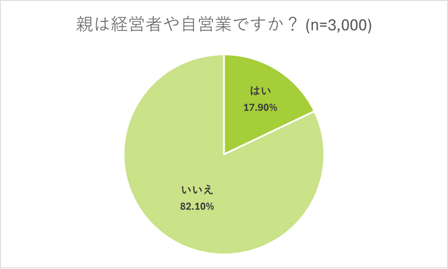 全国20歳~69歳の働く男女3,000人に親が経営者や自営業か質問したところ、17.9%が「はい」と回答しました。