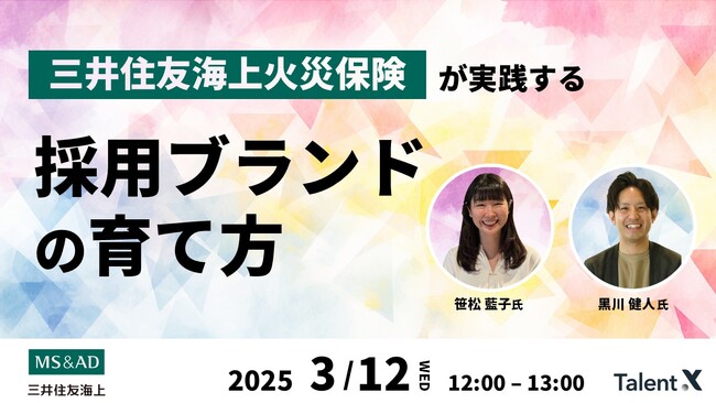 株式会社TalentX(本社:東京都新宿区、代表取締役:鈴木貴史)は、三井住友海上火災保険株式会社(代表取締役社長:舩曵 真一郎、以下 「三井住友海上」)をゲストにお招きして、「三井住友海上火災保険が実践する採用ブランドの育て方」をテーマにお話しいただく採用マーケティングセミナーを3月12日(水)に開催いたします。