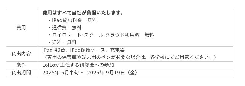 私たちLoiLoは、今年も40台のiPadとロイロノート・スクールを無料で貸出します。貸出料金、通信費、クラウド利用料、送料 すべて無料です。端末にはロイロノートがインストールされており、届いたその日からご利用いただけます。1人1台環境での学びづくりを全力で応援いたします。