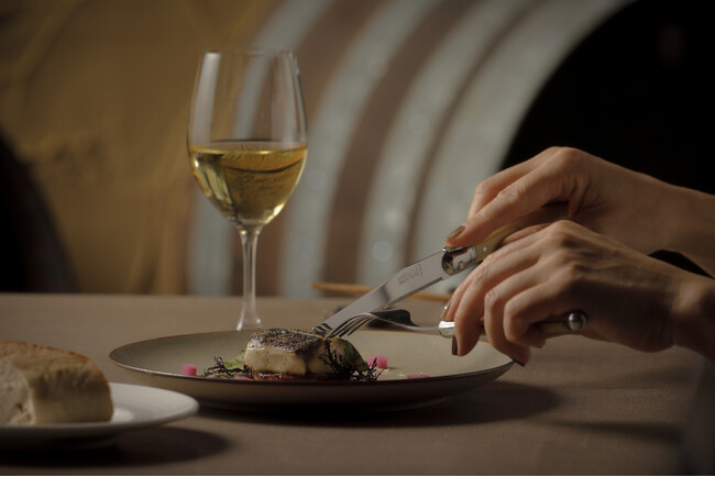 フローラルで華やかなアロマと優しいフルーツの香りが特徴で、フレッシュで生き生きとした酸が、シャープな輪郭を作り出す「京都ワイン(白) ピノ・ブラン 2022」。複数品種のぶどうを混醸し、発酵と同時にろ過をせず酵母や澱(おり)など一緒に瓶詰めした、酸化防止剤無添加スパークリング「京都丹波てぐみ」など、お料理に合わせて丹波ワインが厳選したペアリングワインをご準備いたします。どうぞお楽しみに。