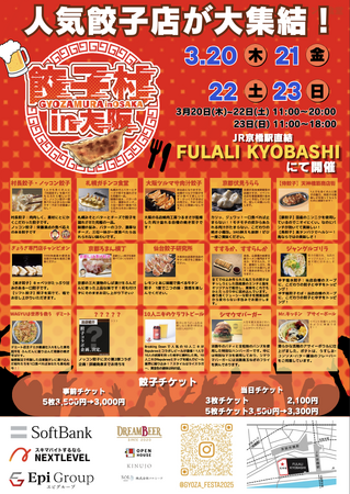 株式会社おにぎり村(代表取締役:池尾俊哉)とFoodFes株式会社(代表取締役:稲垣一馬)は2025年3月20日(木),21日(金),22日(土),23日(日)の4日間、大阪・京橋”FULALIKYOBASHI”にて開催する「餃子村 in 大阪」を開催します!