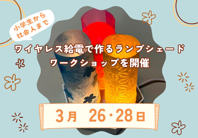 B&PLUSではこの度、皆様にお気軽にワイヤレス給電に触れて頂きたいという想いから、小学生~社会人を対象に、事前予約制のワークショップを開催させて頂きます。ワイヤレス給電の原理である電磁誘導の仕組みを学びつつ、ワイヤレス給電工作キットを使い、簡単なLEDのランプシェードを作成してワイヤレスで点灯させていきます。ご自宅にワイヤレス給電のあかりを灯しませんか?ご応募をお待ちしております。