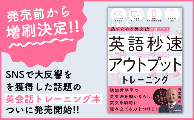 発売前からXで8,000件超のいいねを獲得し、異例の発売前増刷も決定! ベストセラー文法書著者による最注目の英会話トレーニング本が大好評発売! その名も『英語秒速アウトプットトレーニング』!