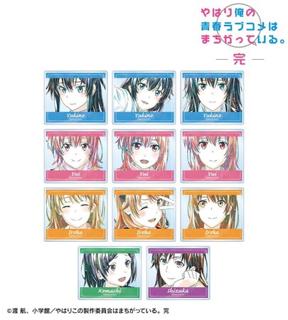 種類 :全11種(雪ノ下雪乃ver.A、雪ノ下雪乃ver.B、雪ノ下雪乃ver.C、由比ヶ浜結衣ver.A、由比ヶ浜結衣ver.B、由比ヶ浜結衣ver.C、一色いろはver.A、一色いろはver.B、一色いろはver.C、比企谷小町、平塚 静)