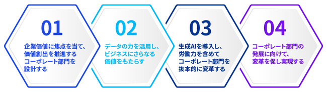 コーポレート部門が組織のバリューストリームに注力し、組織全体と連携し、データを調和させ、新しい技術を統合するにつれて、その能力を再考する必要があります。コーポレート部門の潜在的な可能性を引き出すためのステップは以下の4つです。