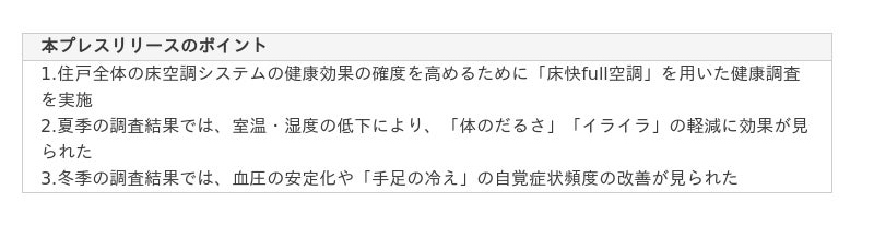 野村不動産株式会社(本社:東京都新宿区/代表取締役社⾧:松尾大作、以下「野村不動産」)と慶應義塾大学(東京都港区)は、「高断熱集合住宅における床チャンバー※1方式の全館空調が住宅内温熱環境と居住者の健康に及ぼす影響(以下「本研究」)」についての共同研究を2022年の夏より行ってまいりました。本研究は、野村不動産が提供する住戸全体の床空調である「床快full空調(ゆかいふる空調)※2」の採用物件に転居した居住者様を対象に、転居前後で温熱環境の他、血圧や睡眠効率などバイタルデータの実測調査を行い、検証を行ったものです。この度、断熱性能や床チャンバー方式の全館空調(床快full空調が該当)が、住宅内の温熱環境や居住者の夏季の睡眠及び冬季の血圧に良い影響を及ぼす結果を得ることができましたのでお知らせいたします。この研究成果は、2024年3月の日本建築学会関東支部研究発表会、8月の日本建築学会大会にて発表されました。また、空気調和・衛生工学会論文集(2025年1月発行)の査読論文にも採録されております。