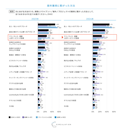 また2023年同様、どの項目も副業の数値が高く、副業を行っている回答者は、案件獲得のために積極的に行動していると考えられます。