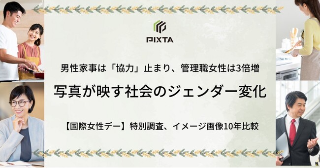 ピクスタ株式会社(東京都渋谷区 代表取締役社長:古俣大介、東証グロース:3416)が運営する、国内最大級の写真・イラスト・動画・音楽素材のマーケットプレイス「PIXTA(ピクスタ)」は、3月8日の「国際女性デー」に合わせて、写真の売れ筋データから「家庭・ビジネスにおけるジェンダーギャップの変化」を分析。2014年と2024年の売れ筋写真を比較することで、社会のジェンダー観がどのように変化したのかを明らかにしました。