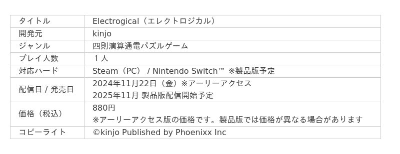 株式会社Phoenixx(フィーニックス)(東京都武蔵野市、代表取締役社長:坂本 和則)は、四則演算通電パズルゲーム『Electrogical』アーリーアクセス版の大型アップデートを実施いたしました。2025年度にリリース予定のSteam製品版と合わせて、Nintendo Switch(TM)版の配信も決定いたしました。