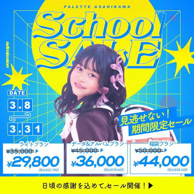 北海道全域に店舗を構える写真工房ぱれっと(本社/有限会社三景スタジオ)。百日記念、ハーフバースデー、1歳お誕生日、七五三記念、入学&卒園記念まで幅広く撮影をしている、市の中でも大型店舗である「旭川店」「帯広店」にて3月限定のサンキューセールを実施中。