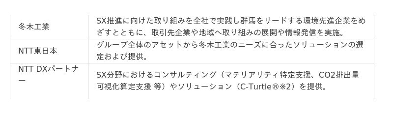 冬木工業株式会社(代表取締役社長:大竹 良明、以下「冬木工業」)と東日本電信電話株式会社 群馬支店(支店長:井原 智直、以下「NTT東日本」)、および株式会社NTT DXパートナー(代表取締役社長:阿部 隆、以下「NTT DXパートナー」)は、サステナビリティ・トランスフォーメーション※1(以下「SX」)推進のための連携および協力に向けた協定を2023年2月22日に締結し、群馬をリードする環境先進企業をめざしたさまざまな取り組みを進めています。