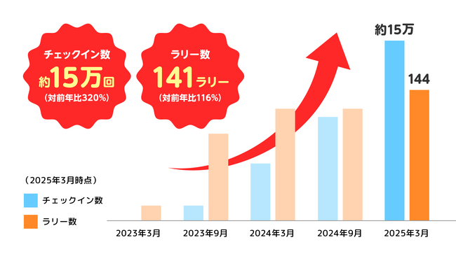2025年3月7日で「みんラリ」は2周年を迎えました。GPSでのチェックインは15万回(対前年比200%増)を超え、よりアクティブなプラットーフォームとして、多くの方に楽しんでいただいております!