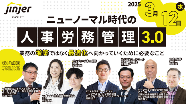 クラウド型人事労務システム「ジンジャー」を提供するjinjer株式会社(本社:東京都新宿区、代表取締役社長:桑内 孝志)は、株式会社Innovation & Co(本社:東京都渋谷区、代表取締役社長:齊藤和馬)と共催で、オンラインイベント「ニューノーマル時代の人事労務管理3.0」を2025年3月12日(水)に開催します。