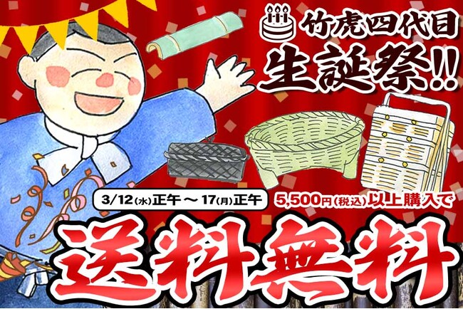 創業明治27年(1894年)より竹材・竹製品製造卸業として皆様にご愛顧いただいている竹材専業メーカーである、虎斑竹専門店 竹虎(運営:株式会社山岸竹材店)です。この度、当社代表取締役社長である山岸義浩 竹虎四代目の誕生月を記念して、生誕祭セールを開催いたします。2025年3月12日(水)正午から3月17日(月)正午までの期間限定で、竹虎本店にて商品代金合計5,500円(税込)以上お買い上げのお客様を対象に、通常22,000円(税込)以上で適用される送料無料サービスを、特別に5,500円(税込)以上でご利用いただけます。北海道・沖縄および離島のお客様も同様に、5,500円(税込)以上のご購入で送料無料となります。