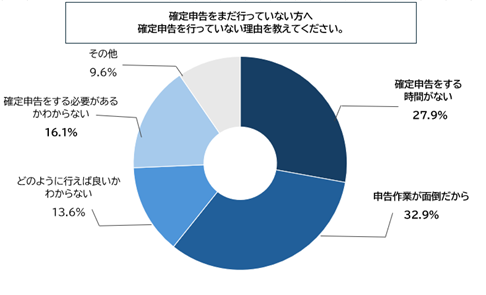 確定申告を実施できていない副業者に対してその理由を調査したところ、60%以上が「確定申告をする時間がない」あるいは「申告作業が面倒だから」という理由で着手していないと回答しました。このことから、やはり確定申告については手間や時間を多く割かなければならず、コストがかかるイメージを持つ方が多いことがわかります。
