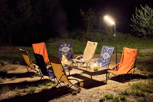 LEDライトは、ぬくもりのある暖色点灯で、明るさはシーンに合わせて3段階に調光可能。非常時に役立つ点滅モードも装備しており、サブライトは、全点灯とスポット点灯が選べる。専用の収納バッグ付きで持ち運びや保管にも便利。