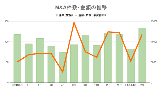【2025年2月M&A統計】134件(前年同月比36件増)、取引総額1兆1778億円