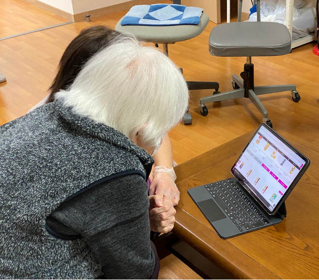 介護サービス利用者が介護施設職員の補助を受けながらオンライン注文している様子