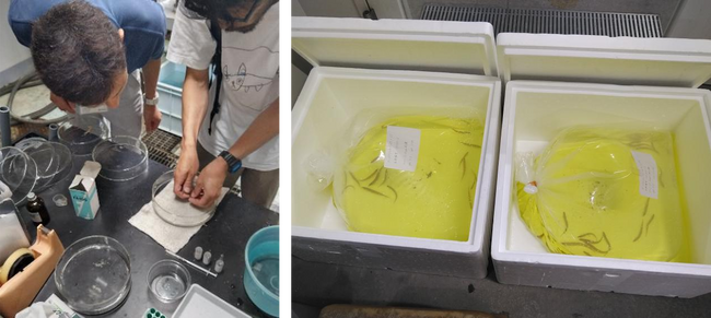写真 左:京都水族館への繁殖作業の技術指導の様子(2024年6月撮影)