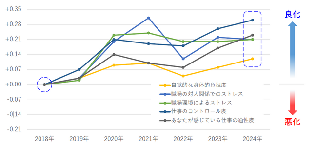 ストレスチェックでは、ストレスの状態だけでなく、ストレスの原因(ストレッサー)についても測定している。測定される9項目――「心理的な仕事の負担(量)」「心理的な仕事の負担(質)」「自覚的な身体負担度」「職場の対人関係でのストレス」「職場環境によるストレス」「仕事のコントロール度」「あなたの技能の活用度」「あなたが働いている仕事の適性度」「働きがい」――について7年前(2018年)と2024年を比較したところ、ほとんどの項目が長期的には良化あるいは同水準で推移するなか、唯一、自分の持っている技術や知識、資格などが仕事で活用されていることを示す「あなたの技能の活用度」のみ、長期的に悪化していた。