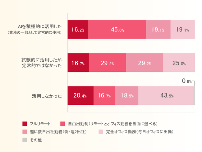 - AI積極活用層の勤務体系は自由度が高い傾向