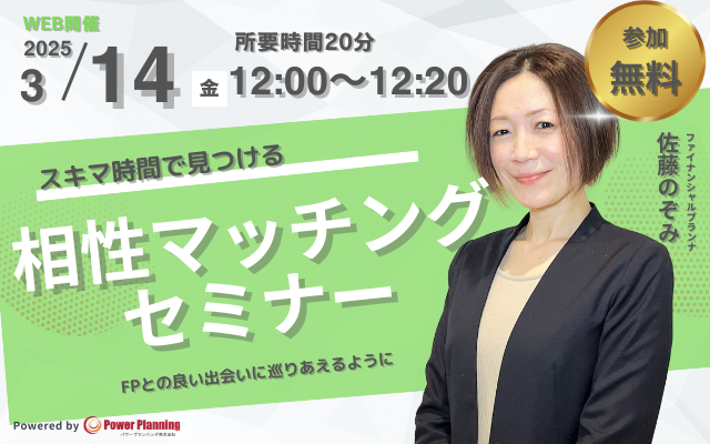 3月14日(金) 12時より、スキマ時間を活用して自分に合ったFPを探すことができる、佐藤のぞみ講師との「相性マッチングセミナー(無料)」を開催いたします。