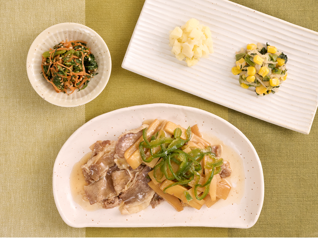 副菜は、香ばしいごまがアクセントの春菊の生姜醤油、コクのあるじゃがいもと玉ねぎのタルタルサラダ、大根の甘みと野沢菜の塩気が相性抜群の切り干し大根と野沢菜の和え物です。