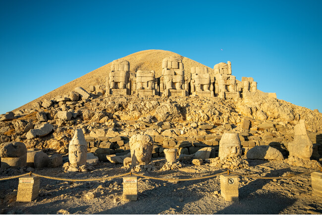 ネムルト山の山頂は、トルコでも最も美しい場所の一つで、広大な平野やユーフラテス川を見渡しながら日の出と日の入りを楽しむことができます。この標高2,150メートルの壮大な山をさらに特別なものにしているのは、コマゲネ王国の記念碑です。2千年以上前から立ち続ける巨大な石像群は、アンティオコス1世(紀元前69~36年)によって建てられ、ローマ帝国と戦った王が不死を求めて作り上げたものです。これらの彫刻は古代から伝説を生み出してきました。現在では観光客に人気のルートとなり、アデゥヤマンの神秘的な山頂ネムルトは、訪れる人々を魅了し続けています。
