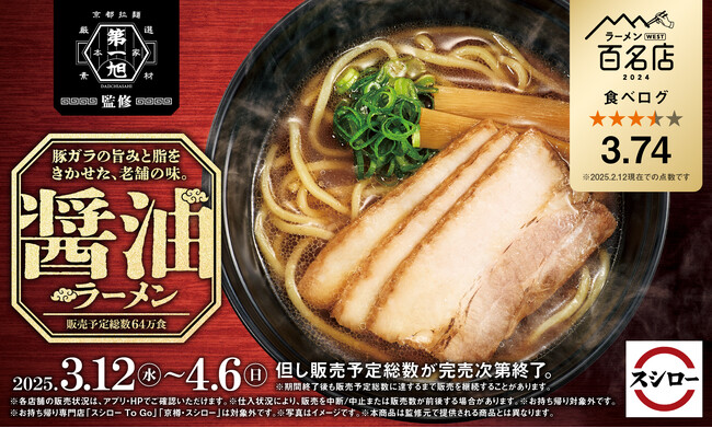 株式会社あきんどスシロー(本社:大阪府吹田市、代表取締役社長:新居 耕平)は、レストラン検索・予約サービス「食べログ(https://tabelog.com/)」とコラボをし、「スシロー×食べログ」全国名店監修シリーズを実施しております。この度は3月12日(水)から、食べログで点数3.74の高評価を獲得し、「食べログ ラーメン WEST 百名店」に6年連続選出された、京都にある豚骨醤油ラーメンの老舗、“本家 第一旭”監修の「醤油ラーメン」を全国のスシローにて販売いたします。