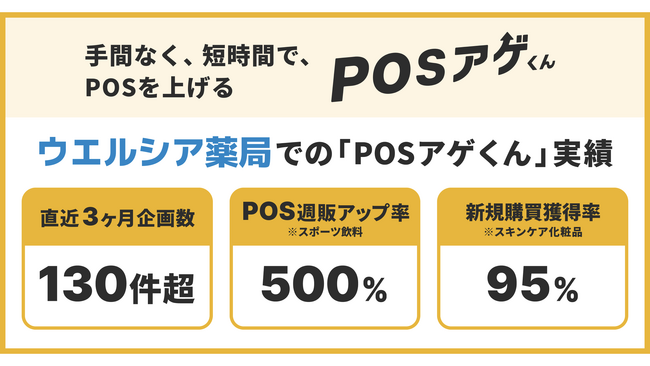 ウエルシア薬局においては、「POSアゲくん」を2024年3月に初めて実施いただいて以降、スポーツ飲料のPOS週販500%、スキンケア化粧品の新規購買獲得率95%などの高い効果の事例が続いたことを受けて実施キャンペーン数が増え、直近3ヶ月の2025年10月~12月では、130件以上の企画実施にまで拡大しています。