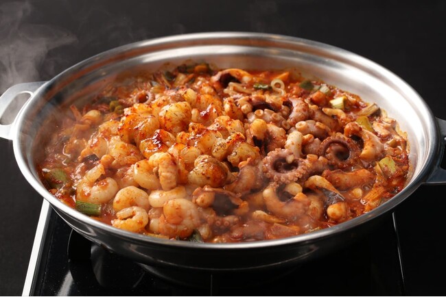 名物ナッコプセは、韓国から直送される手長だこ=“ナッチ”、ホルモン=“コプチャン”、えび=“セウ”の頭文字を組み合わせた、釜山の港町ならではの郷土料理として知られるピリ辛の鍋料理で、テーブル上のコンロで加熱し、具材が煮える過程も楽しむことができます。