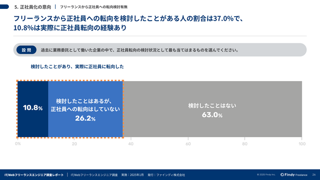 ・フリーランスから正社員への転向を検討したことがある人は37.0%で、10.8%は実際に正社員転向の経験あり。