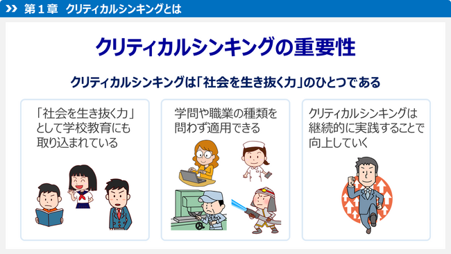今回提供を開始する「クリティカルシンキング基礎講座」シリーズでは、事例を交え、アニメーションと音声を用いてクリティカルシンキングについて分かりやすく解説します。実務での応用を意識したカリキュラムとなっており、社員研修に最適です。