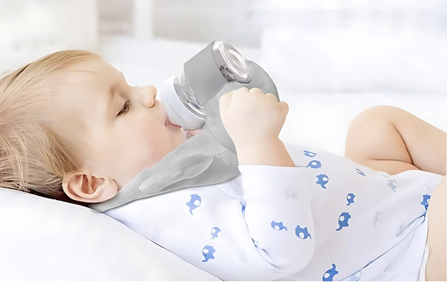 首に掛けて哺乳瓶をセットするだけで、赤ちゃんが自分でミルクを飲める。