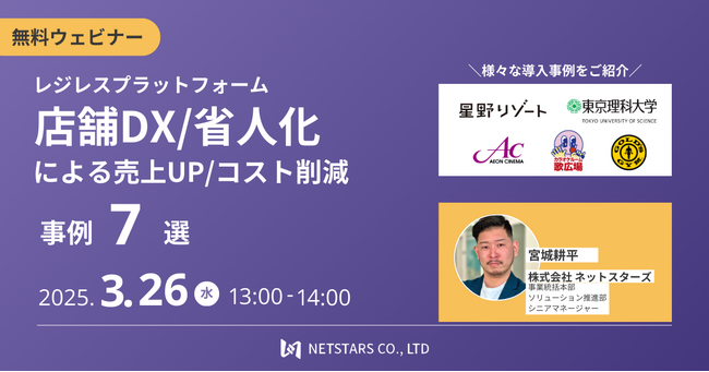 株式会社ネットスターズでは、3月26日(水)13:00より、ウェビナー「レジレスプラットフォーム ~店舗DX・省力化による売上UP/コスト削減事例7選~」を開催いたします。