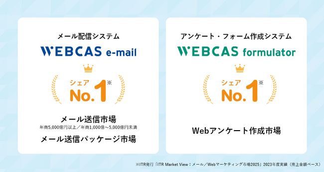 当社のメール配信システム「WEBCAS e-mail」が、ITR発行の市場調査レポート「ITR Market View:メール/Webマーケティング市場2025」において、2023年度メール送信市場(年商5,000億円以上・年商1,000億~5,000億円未満)およびメール送信パッケージ市場のベンダー別売上金額シェア1位を獲得いたしました。同時に、当社のアンケート・フォーム作成システム「WEBCAS formulator」が2023年度Webアンケート作成市場のベンダー別売上金額シェア1位を獲得いたしました。いずれの市場におきましても、2024年度も引き続きシェア1位となる見込みです。