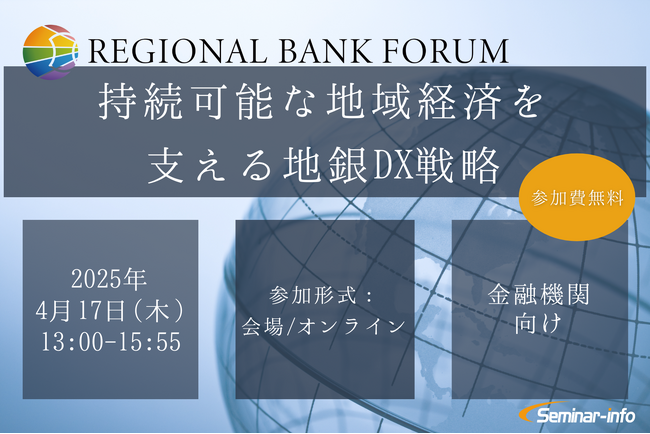 株式会社セミナーインフォ(本社:東京都千代田区 代表:小西 亘)は、2025年4月17日(木)にREGIONAL BANK FORUM「持続可能な地域経済を支える地銀DX戦略」を開催いたします。