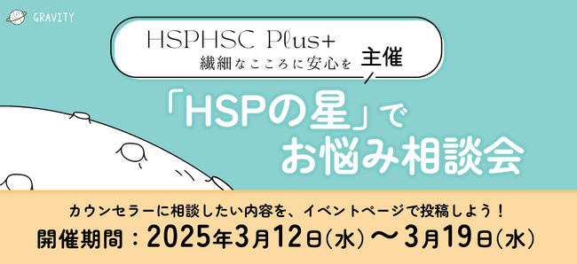 HiClub株式会社(本社:東京都港区、代表取締役社長:古谷由宇)が提供する、やさしいSNS「GRAVITY(グラビティ)(以下グラビティ)」(iOS、Android版)は、より生きやすい、過ごしやすいSNSにしていくため、HSP (Highly Sensitive Person)及びHSC (Highly Sensitive Child)という、生まれつき「非常に感受性が強く敏感な気質を持った人(子ども)」への支援団体HSPHSC Plus+ (本部所在地:埼玉県川越市)と共同で、GRAVITYアプリ内にて相談/質問会イベントを本日3月12日(水)より3月末まで開催しますことをお知らせいたします。