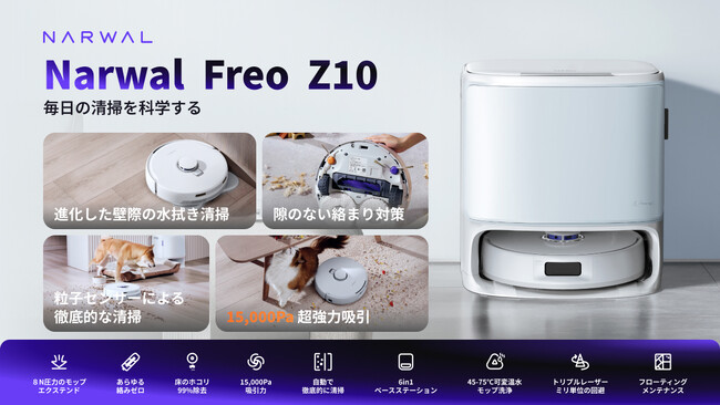2025年3月13日(木)、Narwal Japan株式会社(東京)は、最新のロボット掃除機「Freo Z10」を発売。Freo Z10は、昨年発売したFreo X Ultraをさらに進化させた一台で、当社初となる水拭きモップがサイドに伸びる可動式モップを搭載しつつ、8Nの強力な水拭き圧力、新機能の粒子検知システム、絡まり防止サイドブラシなど、数多くの最先端技術を搭載しています。これにより、ユーザーにより効率的かつ徹底的な清掃体験を提供します。お部屋の清掃が不十分だと感じる方、メンテナンスの手間が煩わしい方にとって、最も理想的な選択肢となる製品です。