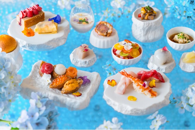 また、「ミニちらし寿司」、「握り寿司3種」、「ミニいなり寿司5種」は、春から初夏にかけて咲く季節の花々をモチーフにした料理長の巧みな技術が光る繊細な寿司をご賞味ください。雨が降り小道を彩る花々が春の花から初夏の花へ変わっていく様子をイメージした「ミニちらし寿司」は、丁寧に小さく引いた鯛、サーモン、鮪で桜の花吹雪を表現し、その上にいくらとスライスした黄色や緑のプチトマトを大きな花びらの形のように配しました。「握り寿司3種」には、高級魚平政(ヒラマサ)とトロ、炙り車海老をご用意。丁寧に編み込んだ平政とねじり切りをしたトロは葉の上を滑り落ちる雨粒をイメージしました。1口サイズの「ミニいなり寿司5種」は、鮪、烏賊(イカ)、サーモンを5月末より開花が始まる薔薇の花に見立てて握り、初夏の訪れを表しました。また贅沢にいくらと雲丹を乗せた2貫のミニいなり寿司もご堪能ください。