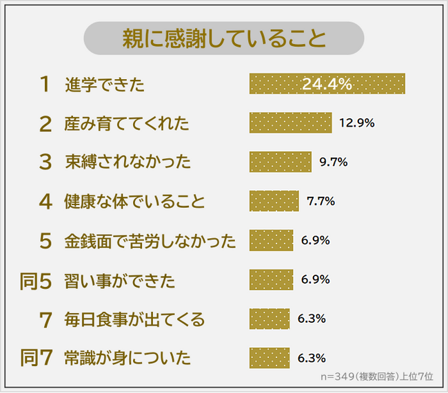 社会人の男女349人に「親に感謝していること」を聞いたところ、圧倒的1位は「進学できた(24.4%)」でした。2位「産み育ててくれた(12.9%)」、3位「束縛されなかった(9.7%)」が続きます。