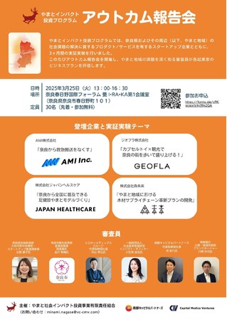 やまと地域(奈良県およびその周辺)の課題解決を目指す「やまと社会インパクトファンド」は、2025年3月25日、「やまとインパクト投資プログラム」で3ヶ月間の実証実験を経たスタートアップ4社が登壇するアウトカム報告会を開催します。ぜひふるってご参加ください。