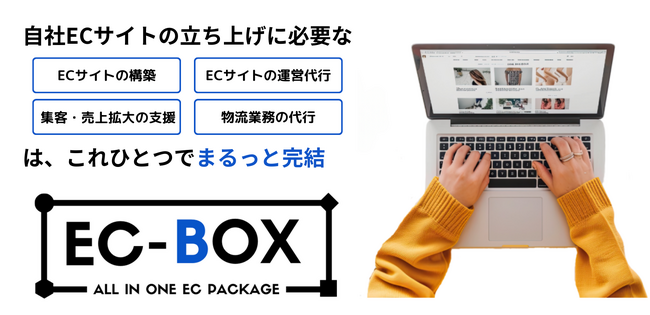 「EC-BOX」では、「ECサイトの構築」「ECサイトの運営」「集客・売上拡大の支援」「物流業務の代行」をオールインワンでサポートします。
